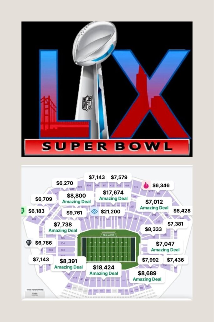 Anndddd Our New England Patriots are BACK in THE SUPER BOWL, led by ace-hotshot-sensation QB #10 Drake Maye and former NE Patriots linebacker 3-Time-Super-Bowl-Winner-Now-Turned-Head Coach Mike Vrabel! Super Bowl LX, Super Bowl 60, shall be played on February 8th, 2026 at Levi’s Stadium, in Santa Clara, California, with the official kickoff time slated for 6:30 PM EST. The NE Patriots vs The Seattle Seahawks will play the biggest game in American sports with broadcast coverage by NBC and Telemundo. Levi’s Stadium capacity is 68,500 seats for the NFL’s marquee game. www.vividseats.com has Super Bowl Tickets with the lowest price starting at $5,703 and states that “Super Bowl ticket prices vary year-to-year and throughout the season. Usually, the cheapest Super Bowl tickets cost around $4,000.” As of the date of this article, there are only 4% of Super Bowl tickets left at www.VividSeats.com with more than 34,327 football fans currently shopping for tickets for the NFL’s grand finale! www.stubhub.com has 6% of Super Bowl Tickets available, with prices ranging from $6,183 to $21,200! You may view a seating map of Super Bowl LX at Levi’s Stadium from www.stubhub.com below: